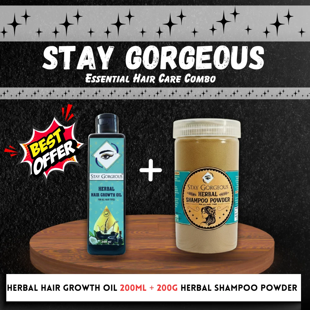 Stay Gorgeous Essential Hair Growth Combo | Results You Can Feel – Experience It Now | Hair Growth Oil 200ml + Shampoo Powder 200g + Freebie