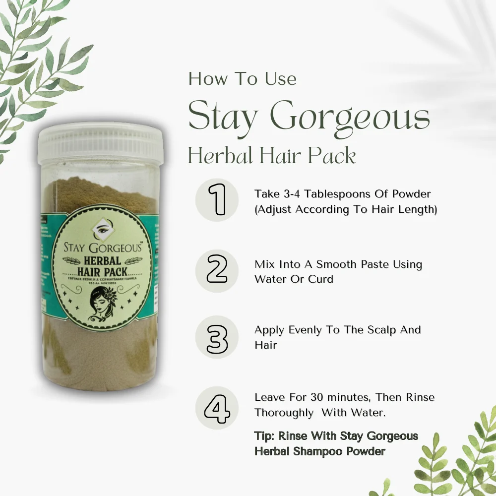 Stay Gorgeous Herbal Hair Pack is a nourishing blend of 30+ carefully shade-dried herbs, specially formulated to deeply condition hair, strengthen roots, and encourage natural hair growth. This traditional herbal formula rejuvenates the scalp, improves hair texture, and restores natural shine.